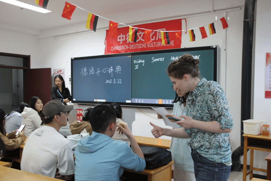 5月21日的“中德国情对对碰”活动现场气氛热烈,白板上陈列着中德国情知识题,从历史名城到现代科技,师生们踊跃答题。德国外教现场助阵,向回答正确的同学颁发奖品,形成“以赛促学”的浓厚氛围。