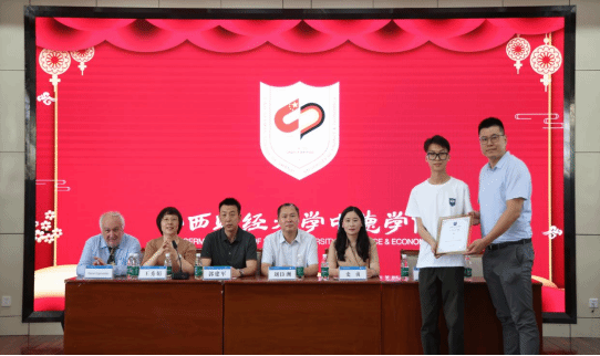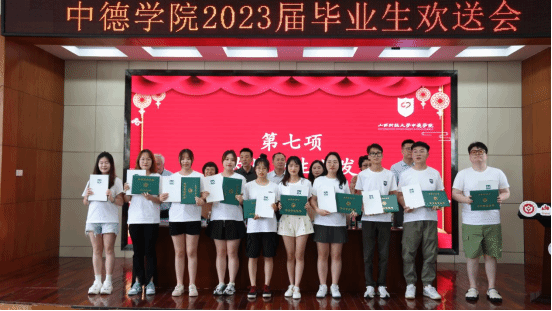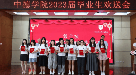 最后学院领导为每一位中德毕业生颁发毕业证书、学位证书,为校级优秀毕业生、院级优秀毕业生颁发荣誉证书,为毕业生2022学年学院专项奖学金获得者颁发证书,为卓越班学生颁发学习证书。校友代表郭宇为2023届毕业生颁布校友牌。颁奖完毕,学院全体教师和毕业生们共同合影留念,留下最美好的一瞬间。
