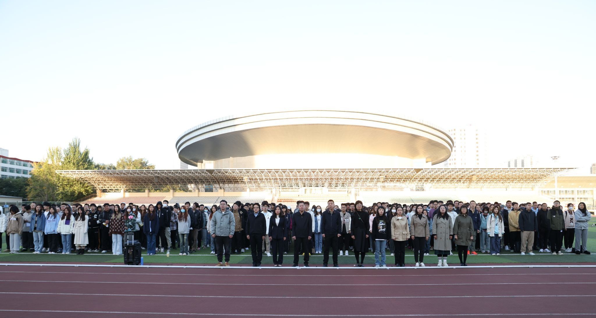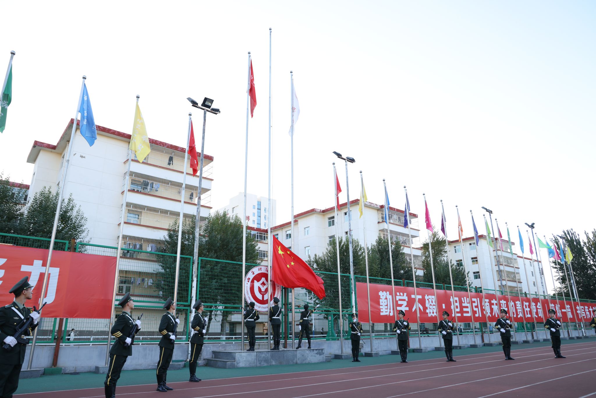 在坞城路校区体育场举行了庄严的升旗仪式,学院全体领导、教职员工和所有在校学生共同参加了升旗仪式。
