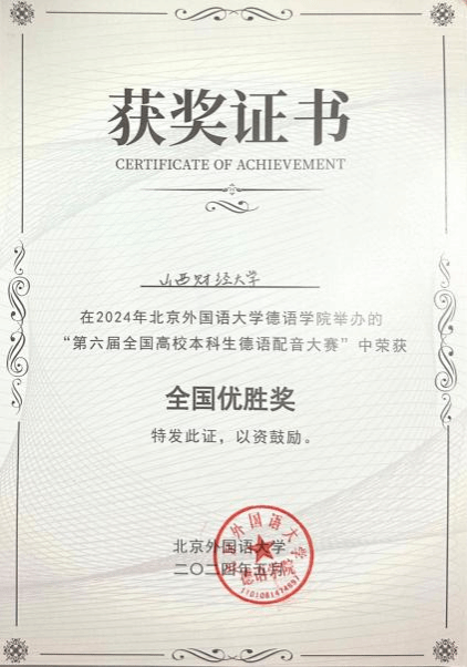 参加比赛,与北京外国语大学、同济大学、南京大学等院校进行激烈角逐,最终取得了优胜奖的成绩。参赛学生分别是2021级杨敏(参赛团队队长)、2022级史本杰、刘思琦、2023级李厚德、王喆、郭嘉文。德语教研室李进、秦雪珂、李冠园以及德方助教Vanessa Schubert等参与指导。