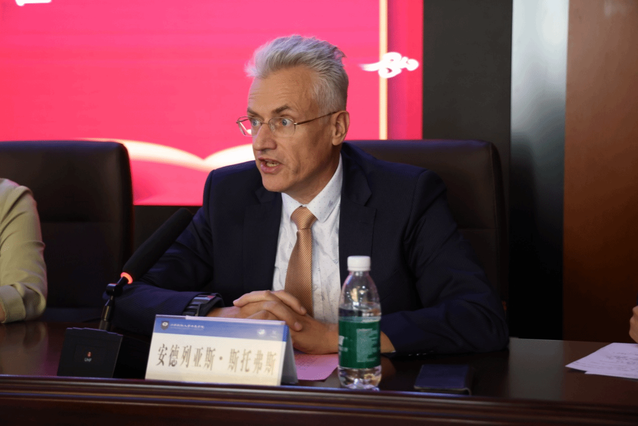 德方教师代表Stoffers Andreas教授强调了学习重要性,指出学好专业知识将成为同学们未来生活的基石,要深入钻研知识,并专注于德语学习。同时,鼓励同学们珍惜大学时光,努力学习,与教师和同学多交流,祝愿2024级同学在德语和经济学的学习上取得圆满成功。