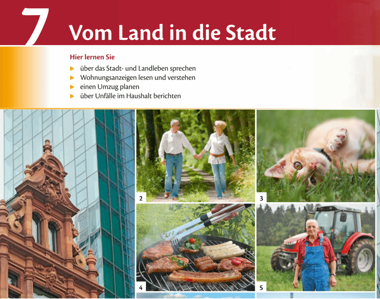 在学习过程中,主要讨论了我们能在城市和农村做什么,城市生活和农村生活有哪些优缺点,以及自己喜欢住在城市还是住在农村。除此之外,还有非常实用的关于在德国找房子和搬家的内容:如何看懂一个租房广告,如何就租房广告里的内容跟房东进行信息的询问,以及搬家准备等相关内容。