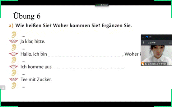 本周继续进行线上教学,线上课虽然对于老师和同学们而言并不陌生,但是对于大一的德语教学,面对德语零基础的同学们,老师们也面临着全新的挑战。正是这种区别于传统教学方法,促使我们进行更加多样化的尝试。就我个人而言,经过这段时间的授课实践,已形成自己特有的网络授课模式。