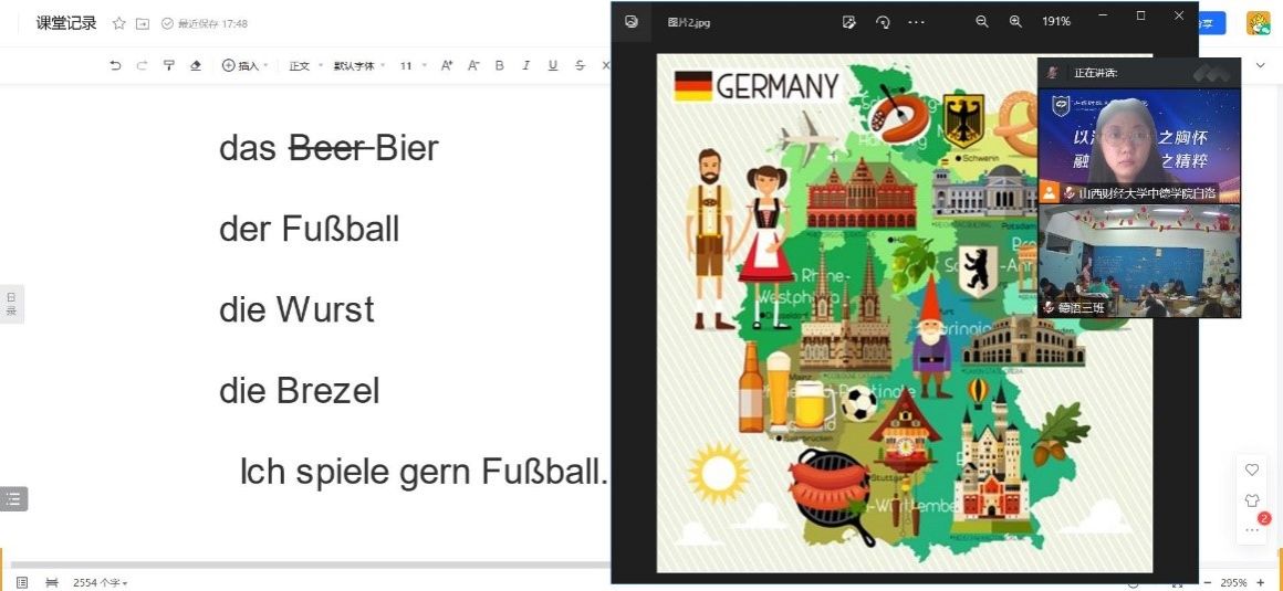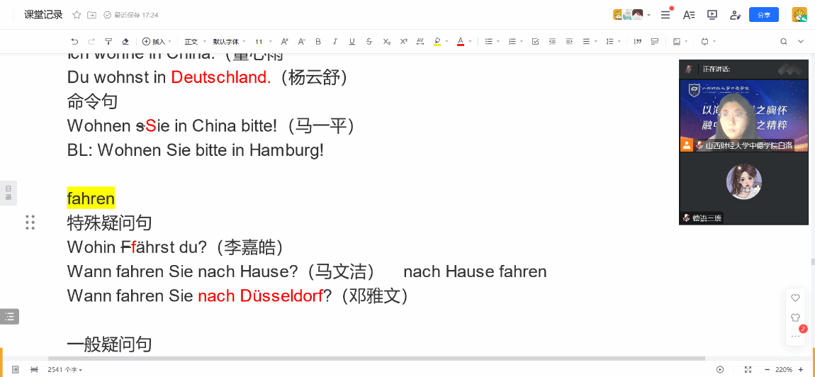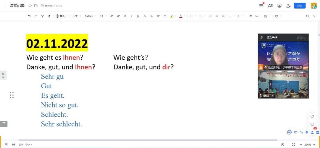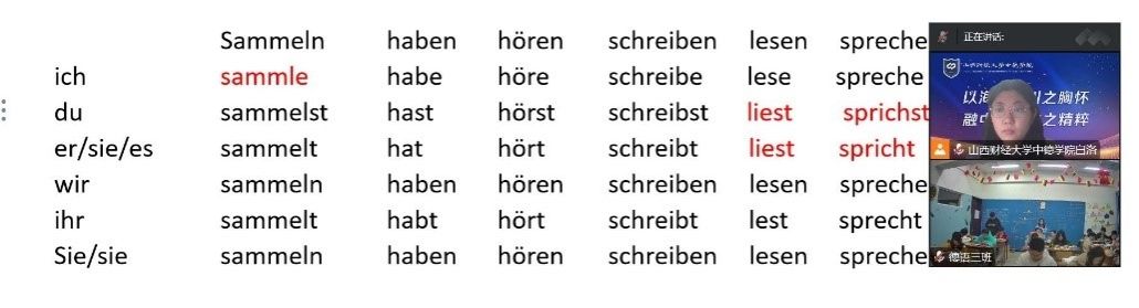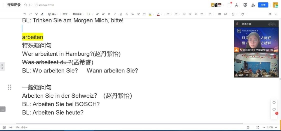 第三周的教学顺利完成,我也积累了利用共享文档展开线上教学的经验。在今后的教学工作中,我会继续尝试新的教学方法和模式,探索新的教学辅助工具,不断提高自己的教学能力。(德语教研室 白洛)