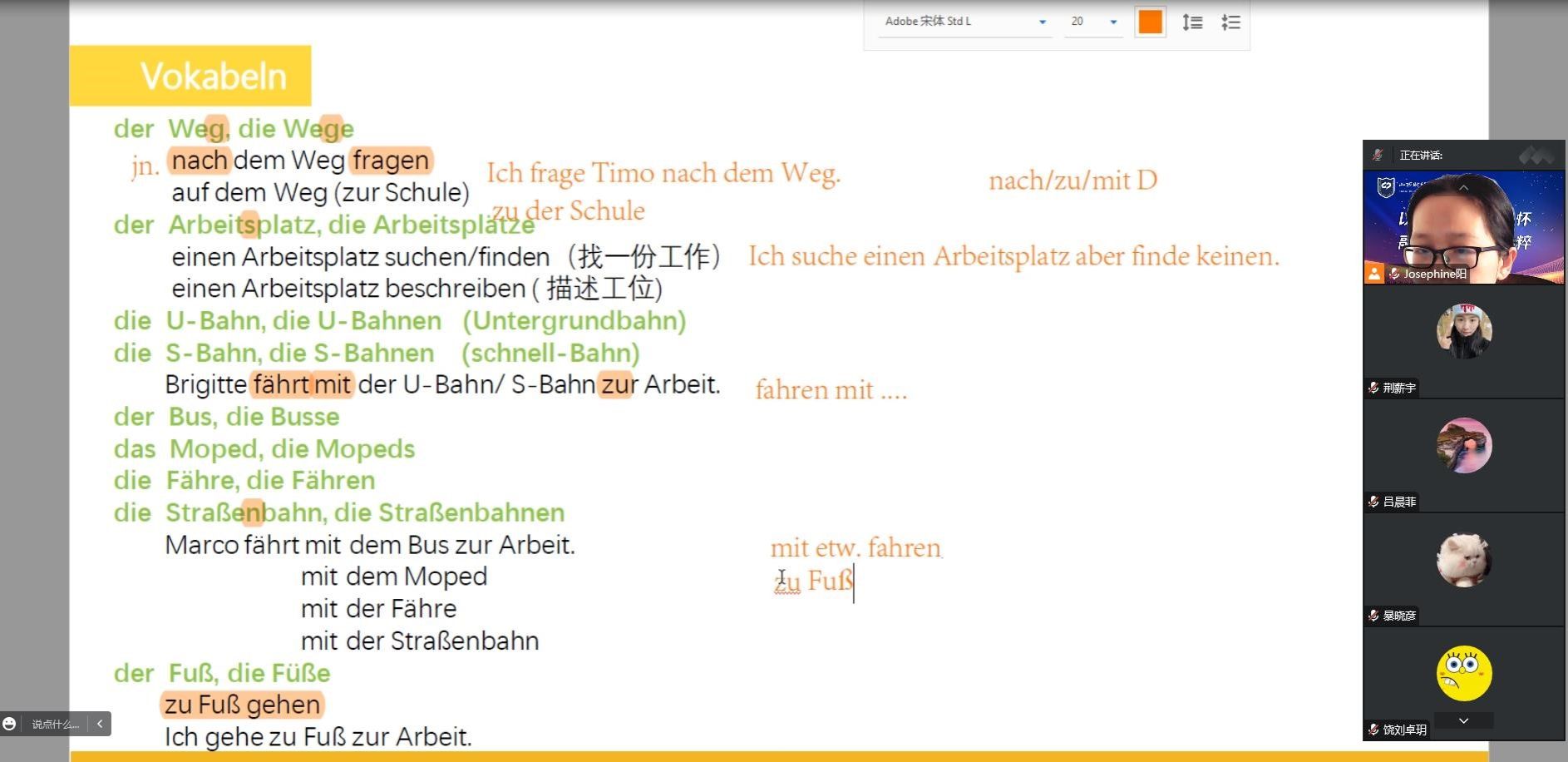 随着多数同学的陆续返乡,我们的线上德语教学也面临新的挑战,如何能让同学们不因返乡而落课,而且返回家之后如何针对全体同学展开德语教学,这是我们全体德语老师面临的新的教学课题。好在疫情以来我们已经积累了不少网上德语授课的经验,结合新的情况,我们也在不断探索和改进新的教学方式。如何从听,说,读,写,练这几个方面着手,取得教学成果的最大化,在这方面我也有了自己的一些新的探索和体会。