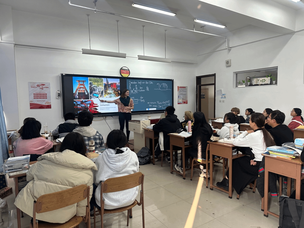 德语教研室特邀德方教师Janika Steiner老师走进大一德语教学小班,与学生进行面对面的交流,营造纯正、沉浸式的德语学习氛围。