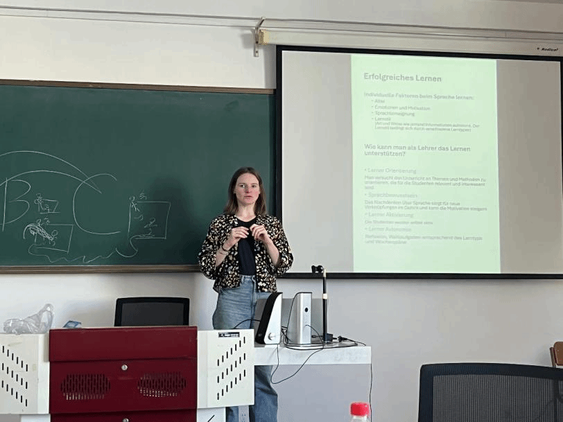 德语教研室召开了一场主题为“如何帮助学生高效记忆单词”的教研会议。此次会议邀请德国歌德学院助教Janika Steiner进行指导,她以丰富的教学经验和专业的学术视角,为参会教师提供了新颖的教学视角和实用的学习策略。