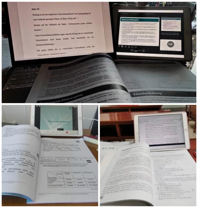 有了第一年的语言基础后,大二我们便开始了德方专业课程的学习,这也意味着我们要尽快适应纯德语的授课环境。虽然大二、大三这两年德国教授们不能亲自来到中国为我们现场授课,但是网课并没有阻碍教授们上课的热情和同学们汲取知识的渴望,很多教授在上课时都会在评论区与同学们互动交流,在同学有问题时也会及时解答,教授们生动的讲解让原本枯燥的专业课知识变的愈发精彩有趣。除此之外,我们的每一门专业课都会有德方助教再次为我们进行答疑解惑,这其实也是一个锻炼语言的好机会。总之,每日课程的预习复习、和教授用邮件交流、不断的考试、各种Praxis以及Projekte等成为了我们正式进入Fom大学学习的常态。在这两年里,我除了德方专业课均分保持在1.3左右,还一次性通过了英语及德语四六级考试。此外,我还积极参加学院组织的学业支持委员会,帮助新生解决学习过程中的疑难问题,多次给大一新生授课辅导德语,通过上台授课辅导,提升了我的语言表达和逻辑思维能力。
