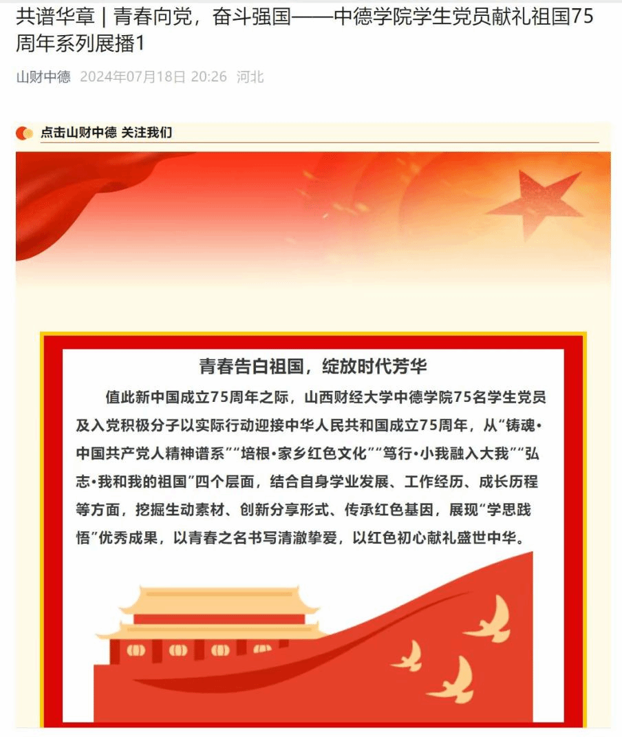 学生党员聚焦“传承红色基因,学思践悟中国共产党人精神谱系”这一主题,结合学习和工作实际,深刻感悟伟大精神,开展专题系列推送,以实际行动庆祝新中国成立75周年。